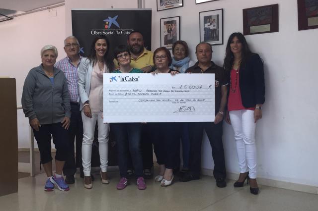Foto: Firma del conveni entre l'Obra Social 'La Caixa' i ASPADI. Voluntaris d'ASPADI, usuaris de l'entitat i representants de CaixaBank.