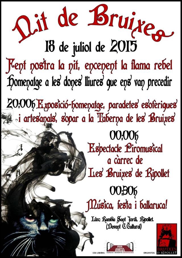 Enguany, la Nit de Bruixes comptarà amb un homenatge especial a totes aquelles dones que han fet possible que la societat canviï. Sota el títol 'Homenatge a les dones lliures que ens van precedir', es presentarà un estudi que ha realitzat l'associació Mai Més. En aquest treball, es repassa la trajectòria de dones com Frederica Montseny, ministra de Sanitat i Assistència Social durant la II República; Margarida Ustrell, educadora nascuda a Ripollet; Grup de Dones de Can Galobart, vinculades a la UGT, molt actives durant la Guerra Civil; i Sàmara Vicente, mestra catalanista, entre d'altres.