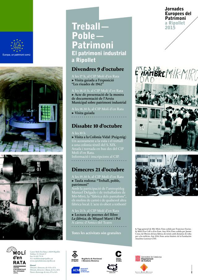 El patrimoni industrial de Ripollet serà l'eix al voltant del qual giraran els actes de les Jornades Europees del Patrimoni que se celebraran els dies 9 i 10 d'octubre. Aquestes Jornades tenen la voluntat de facilitar l'accés i la difusió del patrimoni cultural i són promogudes pel Consell d'Europa i la Comissió Europea. Les activitats programades posaran el focus en el treball de les persones en relació amb la indústria. Es tractarà d'un reconeixement a la memòria obrera i industrial, a les seves lluites i experiències i a la seva contribució en la constitució del patrimoni local.
