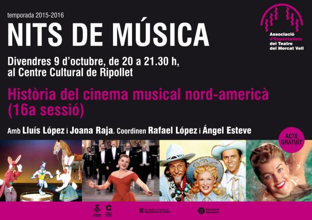El cinema musical nord-americà és el tema escollit per obrir, aquest divendres, 9 d'octubre, la nova temporada de les Nits de música de l'Associació d'Espectadors del Teatre del Mercat Vell. Es tracta de la 16a sessió dedicada a la història del cinema musical nord-americà, que repassarà els anys 1949 i 1950, amb la col·laboració de Joana Raja i Lluís López. Com sempre, sota la coordinació d'Àngel Esteve i Rafael López.