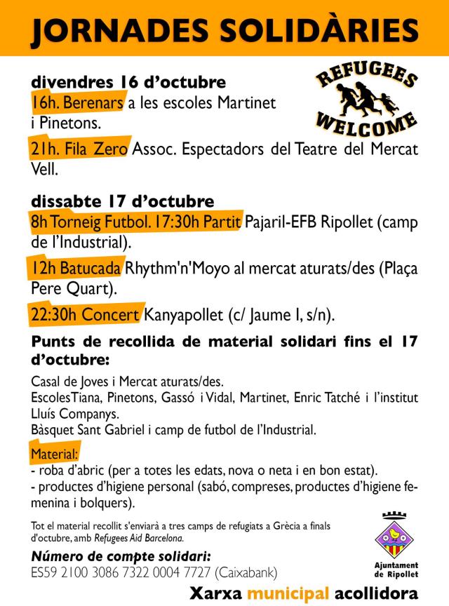 Des d'aquest dimarts, 13 d'octubre, i fins el proper dissabte, dia 17, diferents entitats i col·lectius de Ripollet organitzaran un seguit d'activitats on es realitzarà recollida solidària de materials pels refugiats o bé recollida d'aportacions econòmiques per ajudar a la situació dels refugiats.