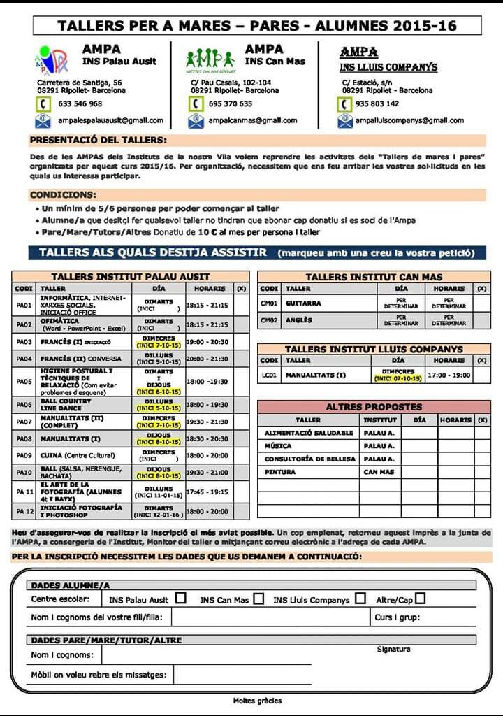 A partir d'aquest octubre, els tres instituts públics de la vila començaran una gran varietat de tallers dirigits a pares i alumnes, organitzats per les seves AMPA. Com a novetat, aquest any podran participar-hi també els mateixos alumnes dels centres educatius. El preu del taller és de 10 euros mensuals per als pares i mares, però és gratuït per als alumnes dels instituts que s'hi vulguin inscriure. Per formalitzar la inscripció, cal emplenar l'imprès i retornar-lo a les juntes de l'AMPA, a les consergeries dels instituts, als monitors dels tallers o bé per correu electrònic a l'AMPA (consulteu document adjunt).