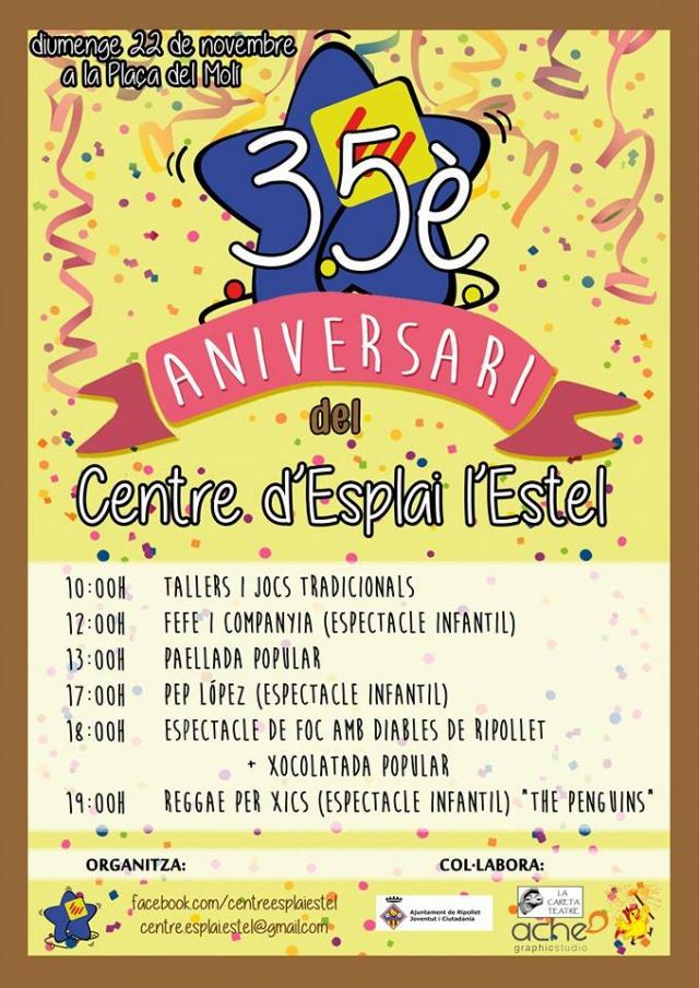 El Centre d'Esplai l'Estel commemora diumenge, 22 de novembre, els seus 35 anys de vida a la plaça del Molí. Ho farà amb una gran celebració a la qual es convida a tothom. A més, es reuniran tant els membres actuals de l'Estel com els exmembres de l'esplai.