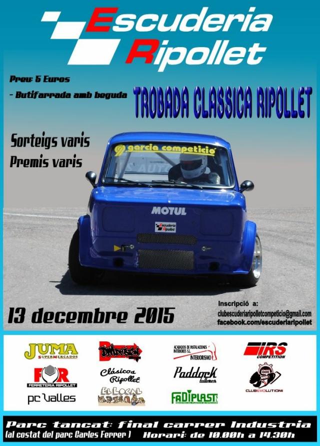 L'entitat dedicada al món del motor Escuderia Ripollet organitza aquest diumenge, 13 de desembre, la Trobada Clàssica, que consistirà en una exposició gratuïta de vehicles clàssics i estants per mirar, remenar o comprar tot tipus de productes relacionats amb el món del motor. La Trobada donarà el tret d'inici a les 10 hores i durarà fins a l'hora de dinar. S'ubicarà al final del carrer de la Indústria, al costat del parc de Carles Ferrer. Durant l'acte es farà entrega de diversos premis i sorteigs. A més, tots els assistents podran gaudir d'una botifarrada a un preu de 5 euros, que inclourà beguda amb servei de bar 0'0.