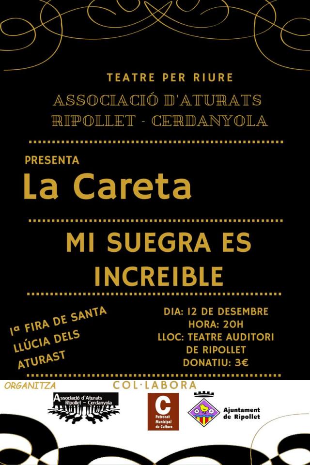 L'Associació d'Aturats Ripollet-Cerdanyola organitza dues activitats durant aquest cap de setmana. Per una banda, l'entitat presenta aquest dissabte, 12 de desembre, a les 20 hores una representació teatral, que es durà a terme al Teatre Auditori del Mercat Vell. Es tracta de l'obra de teatre 'Mi suegra es increible', que serà interpretada per La Careta Teatre. És una comèdia en dos actes, apta per a tots els públics, que l'agrupació teatral ja va representar el mes de maig passat. A l'obra, un home intenta fer-se passar per la seva sogra, que acaba de marxar de casa després d'una discussió, per tal de rebre un premi que només ella pot recollir en persona. L'entrada serà un donatiu de 3 euros.