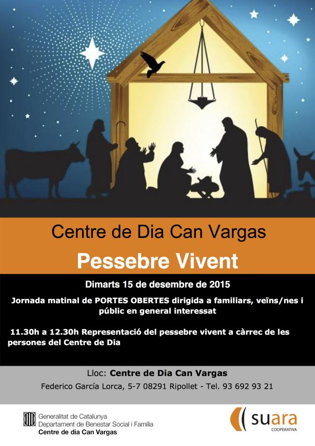 Els usuaris del Centre de Dia Can Vargas organitzaran dimarts, 15 de desembre, un pessebre vivent. Les representacions tindran lloc entre dos quarts de dotze del matí a dos quarts d'una de la tarda i van adreçades a tothom qui estigui interessat. El Centre de Dia es troba als números 5-7 del carrer de Federico García Lorca.