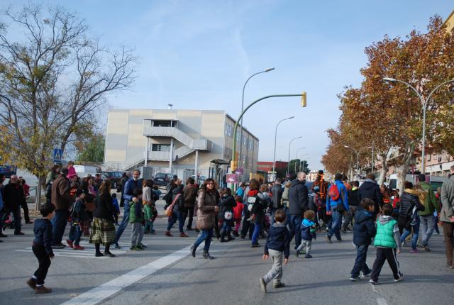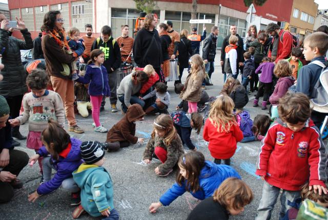 Sota el lema 'Can Mas de les persones, no dels cotxes', desenes de famílies es van aplegar de bon matí al parc del Primer de Maig on van esmorzar i van fer un mural, abans de sortir cap a l'escola a ritme de batucada.