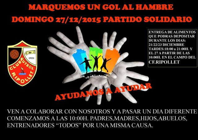 El Camp Municipal de Futbol Industrial acull el 27 de desembre el 7è partit de futbol solidari. Es tracta de passar una bona estona, jugant un partit amistós a canvi de fer un gest solidari. Enguany, durant tot el matí es recolliran aliments per a les persones més necessitades. El lema del partit és 'Marquem un gol a la fam' i el CF Ripollet convida tothom a col·laborar-hi.