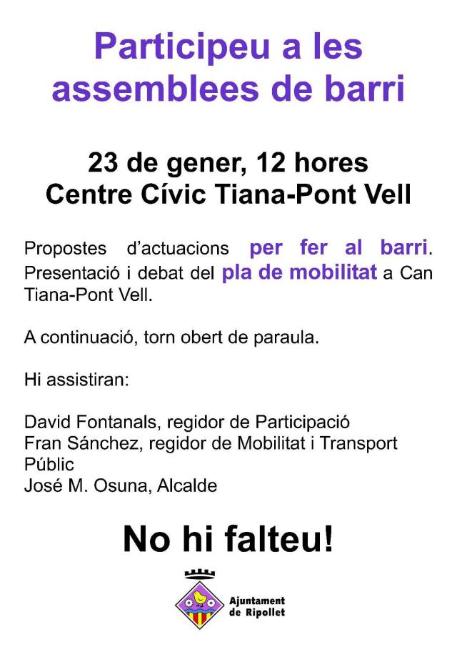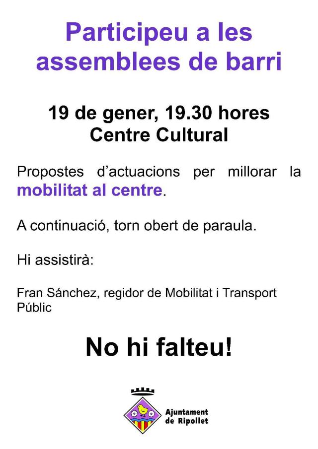 El proper 19 de gener es reprenen les assemblees obertes organitzades per la regidoria de Participació i la de Mobilitat i Transport públic, que es van iniciar el passat mes d'octubre. Els regidors responsables d'aquestes àrees, David Fontanals i Fran Sánchez, respectivament, les van presentar el passat 12 de gener en roda de premsa. A la primera, el dia 19, a les 19.30 hores al Centre Cultural, es parlarà de la mobilitat al centre de Ripollet. A la següent, el dia 23 de gener, a les 12 hores al centre cívic de Can Tiana-Pont Vell, a més de la mobilitat, es parlarà de les propostes per millorar el barri.