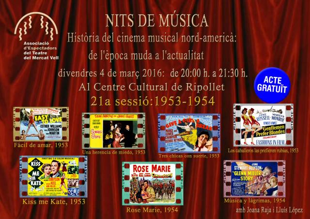 Aquest divendres, 4 de març, el Centre Cultural acull una nova trobada amb les Nits de Música. Es tracta d'una nova sessió dedicada al cinema musical nord-americà, i ja en van 21. En aquesta ocasió, els films que es repassaran i comentaran corresponen als anys 1953 i 1954. Les pel·lícules seran Facil de amar, Una herencia de miedo, Tres chicas con suerte, Los caballeros las prefieren rubias, Kiss me Kate, Rose Marie i Música y lágrimas. La sessió comptarà amb les explicacions de Lluís López i Joana Raja.