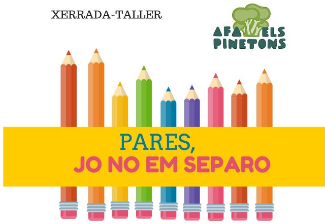 L'Associació de Familiars d'Alumnes Els Pinetons organitza el taller Pares, jo no em separo. Es tracta d'una activitat oberta i gratuïta dirigida als pares i familiars separats o en procés de separació, que tindrà lloc aquest 15 de març de 18.30 a 20.30 h. La intenció del taller és donar a conèixer eines per ajudar a afrontar la situació, proporcionant les pautes necessàries per saber què explicar als fills, dinàmiques que s'haurien d'evitar per ajudar els nens i les coses a tenir en compte en el procés de separació. La xerrada estarà dirigida per Esther Vallbona, psicòloga en l'àmbit de la família del Departament de Justícia de la Generalitat.