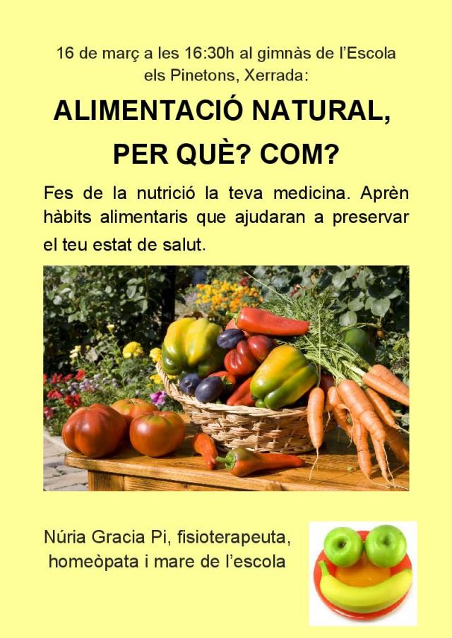 Aquest dimecres, 16 de març, l'Associació de Famílies d'Alumnes de l'Escola Els Pinetons organitza una nova xerrada adreçada tant als infants i a les seves famílies com a monitors, mestres o cuiners. Es tracta de la xerrada 'Alimentació natural. Per què? Com?', que ensenyarà als assistents hàbits alimentaris per preservar un bon estat de salut. La conferència anirà a càrrec de Núria Gracia, fisioterapeuta, homeòpata i mare de l'escola.