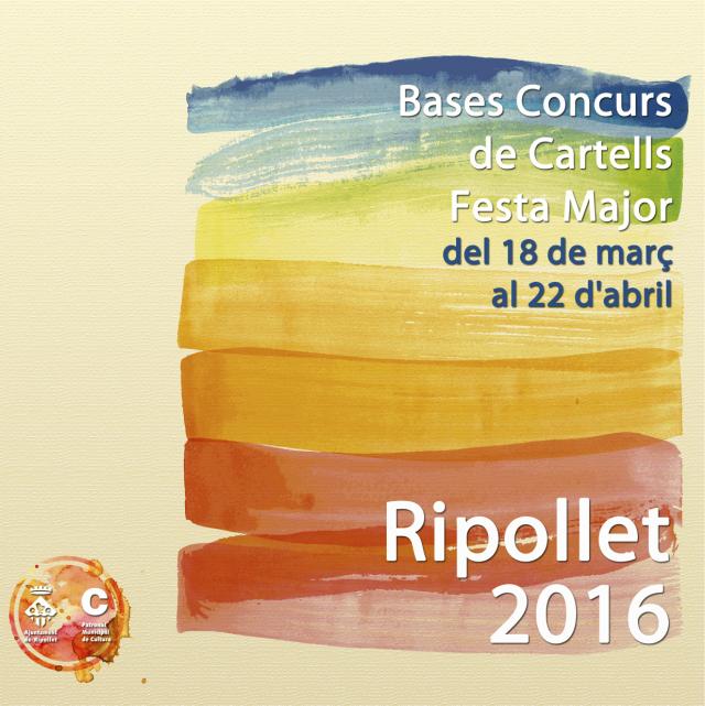 La temàtica del cartell és lliure, però hi ha de figurar la llegenda següent: Festa Major de Ripollet. 26, 27, 28 i 29 d'agost de 2016. La Comissió de la Festa Major i el guanyador de l'any passat seleccionaran 3 propostes, que els ripolletencs podran votar a través del web municipal per escollir quin cartell serà el representant de la festa d'enguany. Les obres es podran trobar a ripollet.cat del 2 al 13 de maig a les 19 hores. El veredicte es farà públic el 17 de maig al Centre Cultural. El premi per al guanyador ascendeix a 600 euros.