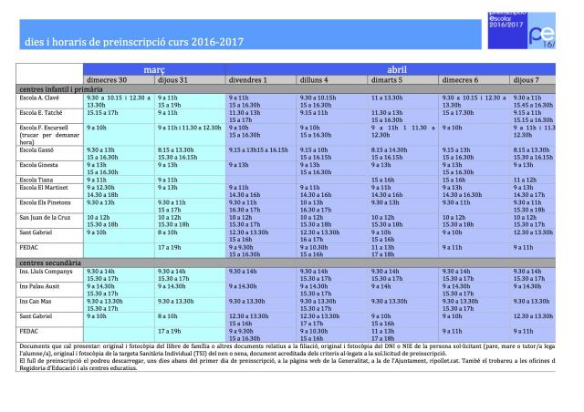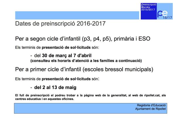 Aquest dimecres, 30 de març, comença la preinscripció escolar per als infants que facin el segon cicle d'Educació Infantil, Primària i Educació Secundària Obligatòria (ESO). Les sol·licituds s'hauran de presentar fins dijous vinent, 7 d'abril. L'imprès es pot recollir a qualsevol centre escolar de la vila o es pot imprimir des de la pàgina web del Departament d'Ensenyament de la Generalitat. El full s'ha d'entregar dins del termini a l'escola o l'institut que s'esculli com a primera opció. Es poden demanar tants centres com es vulgui, però només s'ha de lliurar una preinscripció per persona.