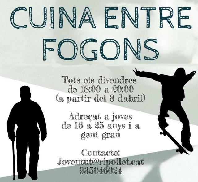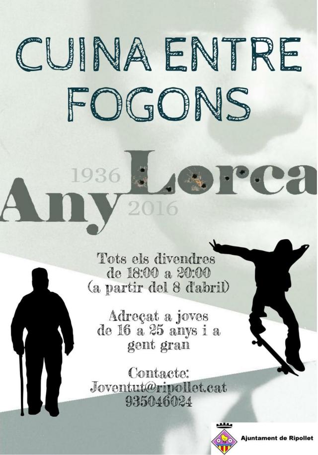 Aquest divendres, 8 d'abril, la Regidoria de Joventut inicia el projecte "Cuina entre fogons", inclòs en el programa de l'Any Lorca Ripollet. Aquest projecte té com a objectiu l'intercanvi de coneixements de cuina entre la gent jove i la gent gran. Els avis i àvies explicaran receptes de la cuina de sempre al jovent i, alhora, aquests ensenyaran quins són els seus plats. Aquesta activitat està organitzada per la regidoria de Joventut amb la col·laboració de la regidoria de Serveis Socials i el Casal d'Avis de Ripollet.