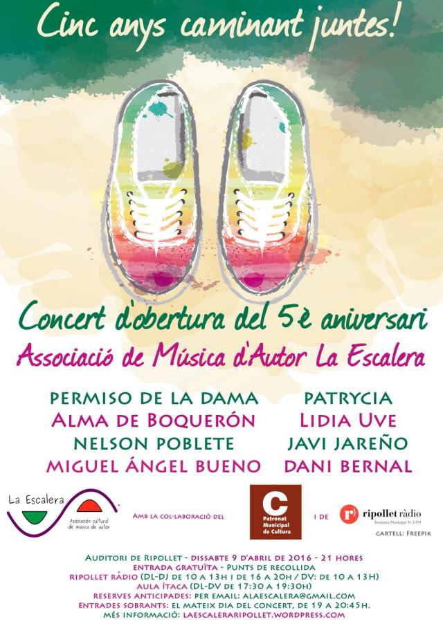 Aquest divendres, 9 d'abril, La Escalera estrena els actes d'aniversari amb el concert d'obertura '5 anys caminant juntes'. Es tracta d'un concert a càrrec de 8 cantautors que, com els mateixos membres de La Escalera reconeixen, "han ajudat molt a l'associació durant tots aquests anys". Aquest primer concert se celebrarà el 9 d'abril, al Teatre Auditori, a les 21 hores, i hi prendran part els artistes Permiso de la Dama, Patrycia, Dani Bernal, Miguel Ángel Bueno, Javi Jareño, Nelson Poblete, Lidia Uve i Alma de Boquerón.
