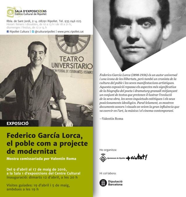 El Centre Cultural acull aquest dimarts, 12 d'abril, a les 20 hores, la inauguració oficial de l'exposició 'Federico García Lorca. El poble com a projecte de modernitat'. Es tracta d'una exposició documental, comissariada pel ripolletenc Valentí Roma, que recorre la biografia de Lorca mitjançant poemes, textos, fotografies i materials periodístics. La mostra es podrà visitar a la Sala 1 fins al 17 de maig. El pròxim 19 d'abril, a les 19 hores, el mateix Valentí Roma oferirà una visita guiada per l'exposició.