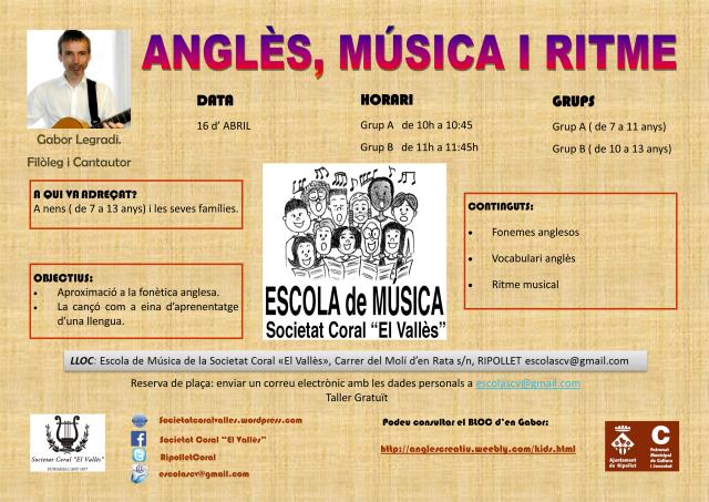 L'Escola de Música de la Societat Coral El Vallès imparteix un taller gratuït d'anglès, música i ritme, que tindrà lloc el pròxim dissabte 16 d'abril. Aquest està adreçat a nens, d'entre 7 i 13 anys i les seves famílies, que vulguin aproximar-se a la fonètica anglesa amb la cançó com a eina d'aprenentatge. El taller anirà a càrrec de Gabor Légrádi, filòleg i cantautor.