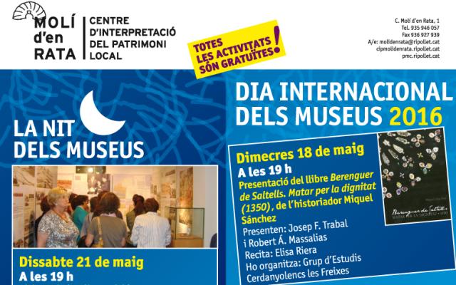 Dimecres, 18 de maig, arrenca la programació del Dia Internacional dels Museus. Serà a partir de les set de la tarda amb la presentació del llibre Berenguer Saltells. Matar per la dignitat (1350), de l'historiador Miquel Sánchez. L'acte tindrà lloc al CIP Molí d'en Rata i anirà a càrrec de Josep F. Trabal i Robert Á. Massalies. Elisa Riera en recitarà uns fragments.