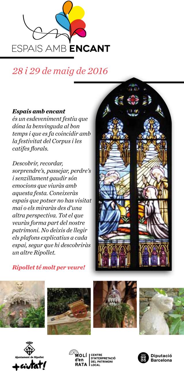 La Regidoria de Patrimoni i Memòria Històrica, en col·laboració amb entitats, veïns i veïnes, floristeries i artistes locals, organitza el 28 i 29 de maig una nova edició dels Espais amb Encant, més extensa i amb més activitats culturals. La intenció és la de potenciar i dinamitzar el centre històric de Ripollet amb una festa per mostrar l'encant patrimonial i històric del nucli antic.