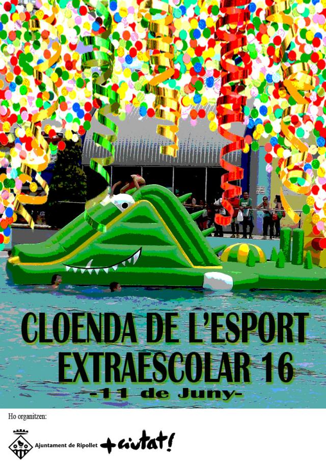 El Patronat Municipal d'Esports prepara una festa amb motiu de la cloenda de l'esport extra escolar amb l'objectiu d'acomiadar la temporada esportiva escolar 2015-2016. La festa tindrà lloc aquest dissabte, 11 de juny, des de les 9.45 fins a les 13 hores a les instal·lacions del Poliesportiu. Els nens, a partir de P5, disposaran de diverses propostes lúdico-esportives.