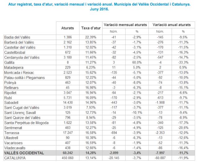 Tot i això, la tendència en l'últim any és positiva, com ho demostren les dades del juny del 2015. Respecte fa un any, l'atur s'ha reduït en prop de 8.000 persones a la comarca, de les quals 217 són de Ripollet. Així, tot i la baixada de la taxa d'atur, Ripollet es manté dos punts per sobre de la mitjana del Vallès Occidental, que és d'un 14,28% i més de tres punts per sobre de la mitjana de Catalunya, on la reducció de l'atur l'últim any ha estat de l'11,9%, restant en un 13,14% el mes de juny.
