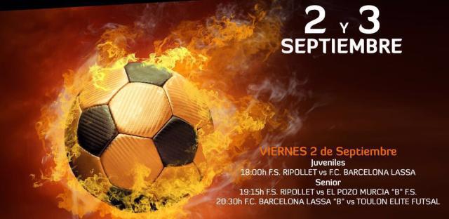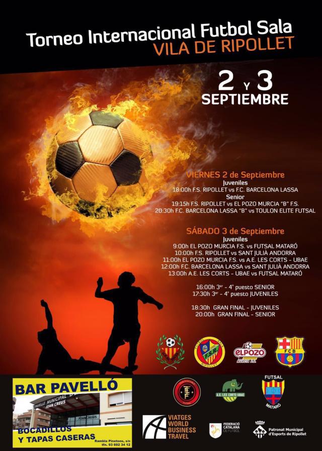 Aquest divendres, 2 de setembre, es donarà el tret de sortida d'una nova edició del Torneig Internacional Futbol Sala Vila de Ripollet, que any rere any organitza el FS Ripollet. Aquest any, el cartell de participants és de luxe, tant en la categoria sènior com dels juvenils. Enguany, el Pavelló Municipal Joan Creus rebrà la visita del primer equip del FC Barcelona Lassa. A més, també hi acudirà el segon equip del Pozo Murcia, campió de Segona Divisió la temporada passada. Per últim, també hi participarà el Toulon Elite Futsal, equip de la Primera Divisió francesa.