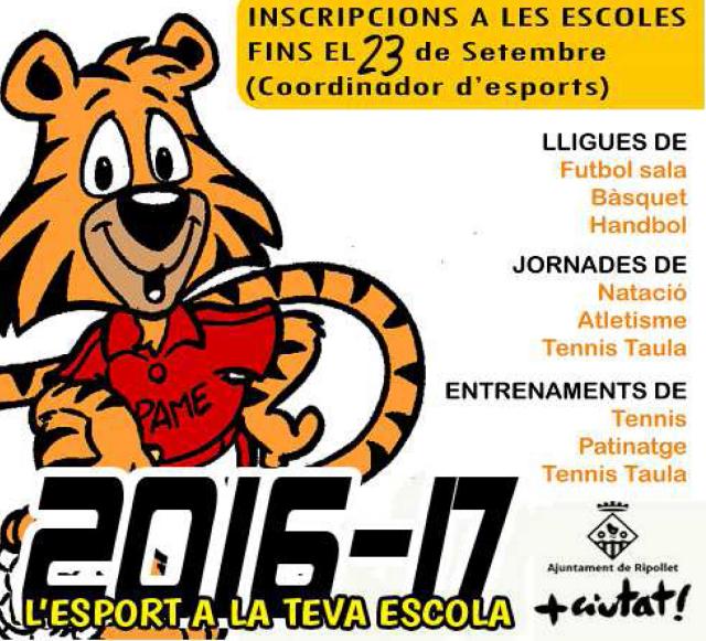 Durant aquesta setmana s'estan realitzant les inscripcions a les activitats esportives extraescolars. Fins a dilluns vinent, 26 de setembre, hi ha temps per lliurar el full d'inscripció a la mateixa escola o institut de l'infant o jove. Durant aquests dies es formalitzen les inscripcions de primària, secundària i en els equips.