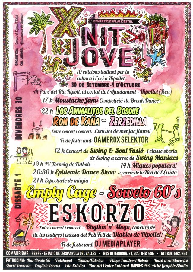 Avui divendres, 30 de setembre, comença la desena edició de la Nit Jove que organitza el Centre d'Esplai l'Estel. L'activitat, que s'allargarà també al dissabte, 1 d'octubre, tindrà com a escenari el parc del Riu Ripoll. Aquest any hi haurà concerts de grups prou coneguts com Eskorzo o Soweto, a més de l'actuació de formacions locals com els Animalitos del Bosque, Ron de Caña i Zerzedilla. També hi haurà classes de swing, una competició de breakdance i es recupera el concurs de menjar flam. En la secció de l'Agenda es troba la programació completa.