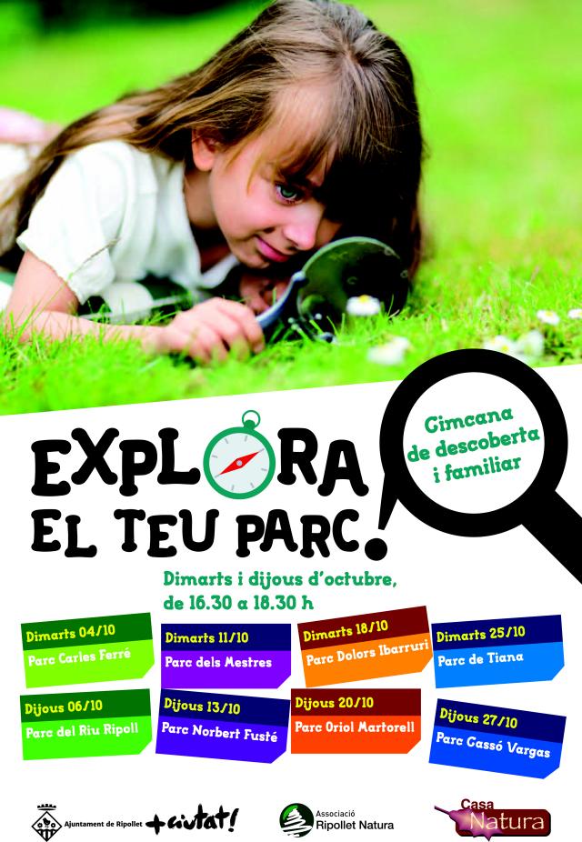 Dimarts, 4 d'octubre, torna el projecte de dinamització de parcs 'Explora el teu parc', que es durà a terme tots els dimarts i dijous, de 16.30 a 18.30 h. La Casa Natura oferirà una gimcana de descoberta dels parcs de Ripollet que començarà avui al parc Carles Ferré, al barri de Can Mas.