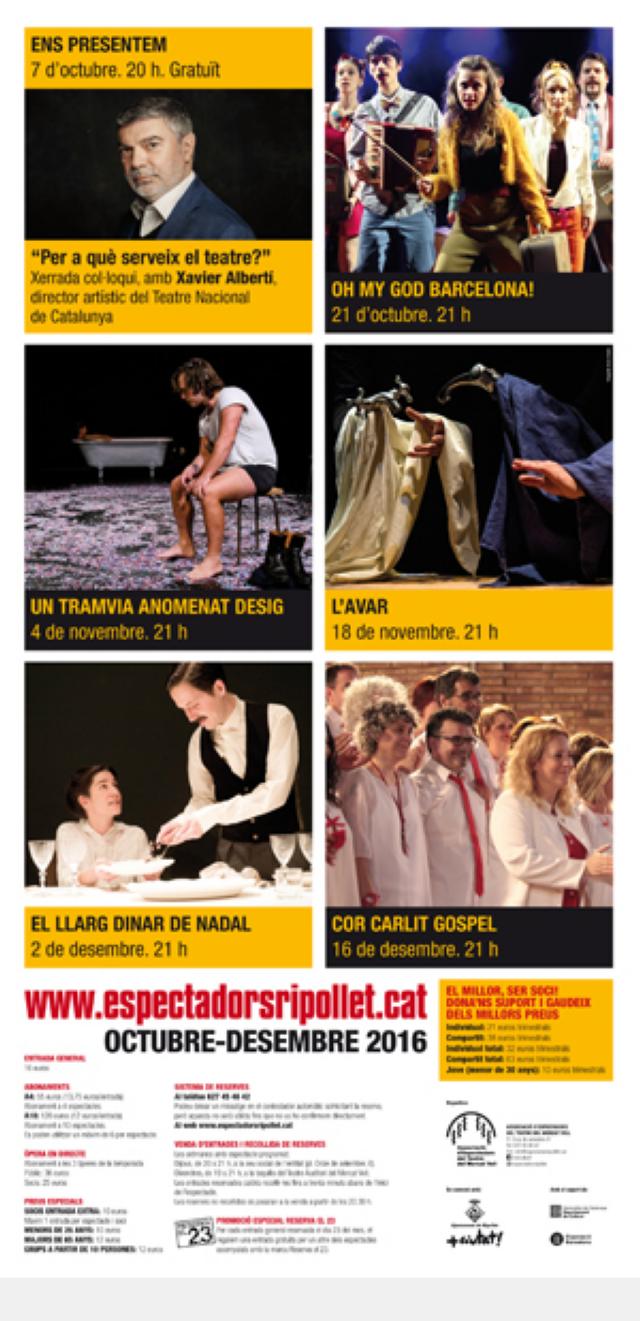 Respecte als espectacles que presenta l'entitat durant l'últim trimestre de l'any, Joan Ramon Gordo va destacar a principis de setembre que "es tracta d'una oferta força variada", amb espectacles que han tingut una bona repercussió en altres teatres. El següent espectacle serà el 21 d'octubre. Es tracta de Oh my God Barcelona!, una òpera bouffe (un estil còmic d'opereta), interpretada per la companyia Bratislava.