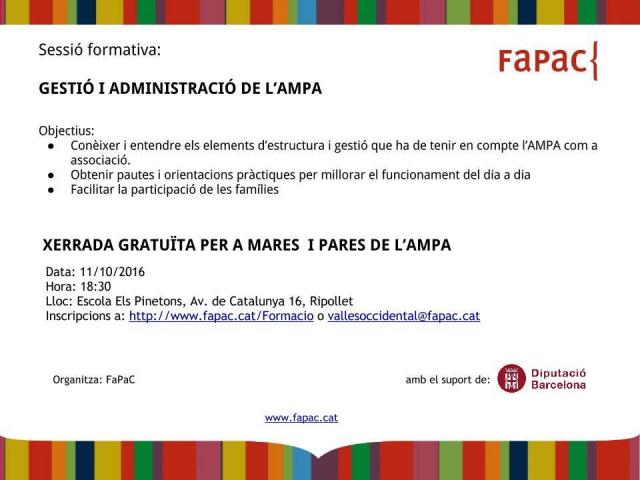 La Fapac (Federació d'Associacions de Mares i Pares d'Alumnes de Catalunya) organitza aquest dimarts, 11 d'octubre, una sessió formativa per a tots els membres de les AMPA de Ripollet. Aquesta tindrà lloc a les 18.30 hores, a l'escola Els Pinetons (Av. de Catalunya, 16). Es tracta d'una xerrada gratuïta i les inscripcions s'han de realitzar al portal web de la Fapac o al correu electrònic vallesoccidental@fapac.cat.