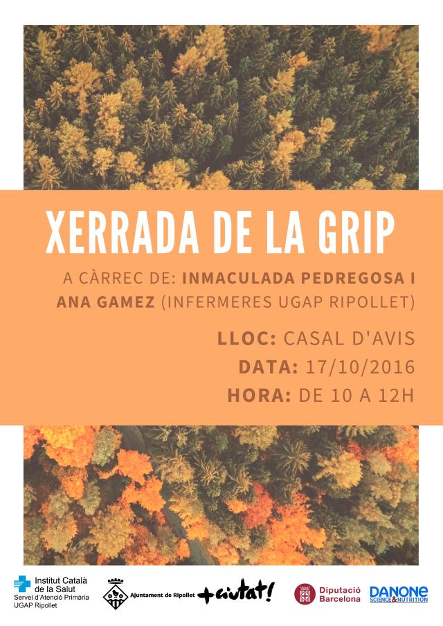 El Casal d'Avis acollirà el proper dilluns, 17 d'octubre, una xerrada sobre la grip a càrrec d'Immaculada Pedregosa i Ana Gámez, infermeres de la Unitat de Gestió d'Atenció Primària (UGAP) de Ripollet. Segons ha informat la Generalitat de Catalunya, la campanya de vacunació antigripal estacional 2016-2017 començarà el dilluns 24 d'octubre. La xerrada té com a objectiu explicar qüestions bàsiques com què és la grip i com es pot prevenir, què són els antivirals, perquè cal vacunar-se cada any o quins són els grups als quals se'ls recomana especialment vacunar-se. Les persones a les quals els està indicada la vacuna poden rebre-la gratuïtament al seu centre d'atenció primària de salut.