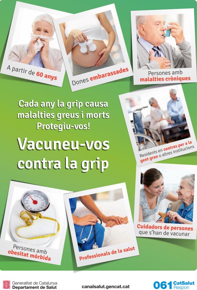 Aquest dilluns, 24 d'octubre, comença la campanya de vacunació contra la grip a Catalunya. L'objectiu fonamental és evitar complicacions en persones amb problemes de salut crònics, d'edat avançada o altres condicions que les fan especialment susceptibles. A través de l'Agència de Salut Pública de Catalunya (ASPCAT), el Departament de Salut ha comprat i distribuït 1.180.000 dosis de vacunes per tal d'immunitzar els grups de població que es consideren prioritaris. Les vacunes estan disponibles a tots els centres d'atenció primària (CAP) i altres centres vacunals. Està recomanat vacunar-se entre els mesos d'octubre i desembre. Cal recordar que cada any el virus de la grip canvia i que, per tant, cal tornar-se a vacunar de nou.