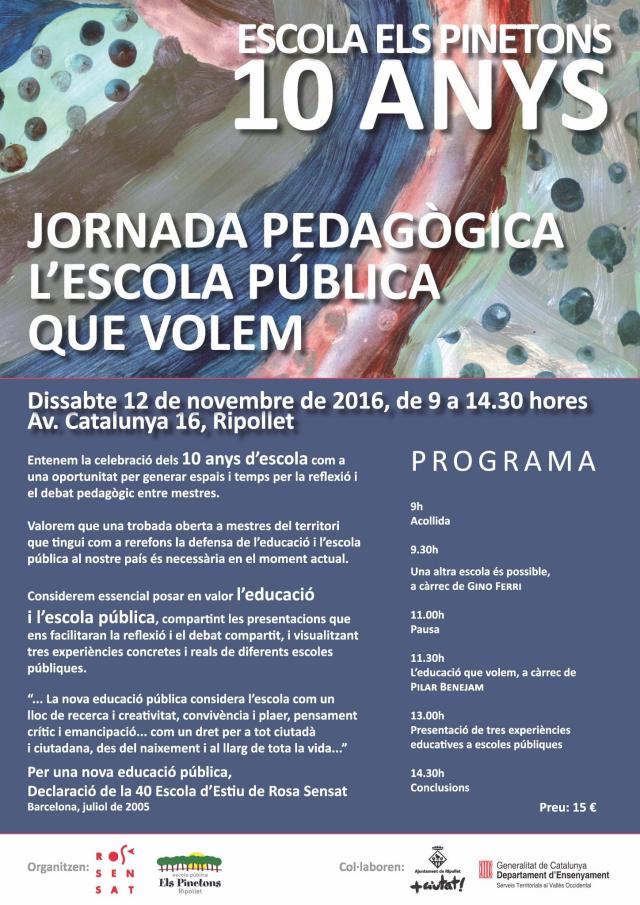 'L'escola pública que volem' és el títol de la jornada pedagògica que Els Pinetons ha organitzat per al pròxim dissabte, 12 de novembre, en el marc del seu 10è aniversari. L'acte comptarà amb les intervencions de Gino Ferri, expert en educació i formador de mestres de Reggio Emilia, a Itàlia, i la pedagoga Pilar Benejam. Els Pinetons ha organitzat aquesta activitat amb l'Associació de Mestres Rosa Sensat i preveu comptar amb més de 120 mestres d'arreu de Catalunya.
