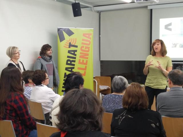 A continuació, Montserrat Trilles i Lídia Ponsatí van explicar el funcionament del Voluntariat per la llengua i van donar orientacions concretes per a voluntaris i aprenents, la llista d'entitats i comerços col·laboradors de la població i el carnet del VxL (que dóna avantatges als participants). Un cop fet això, es van formar les parelles lingüístiques.