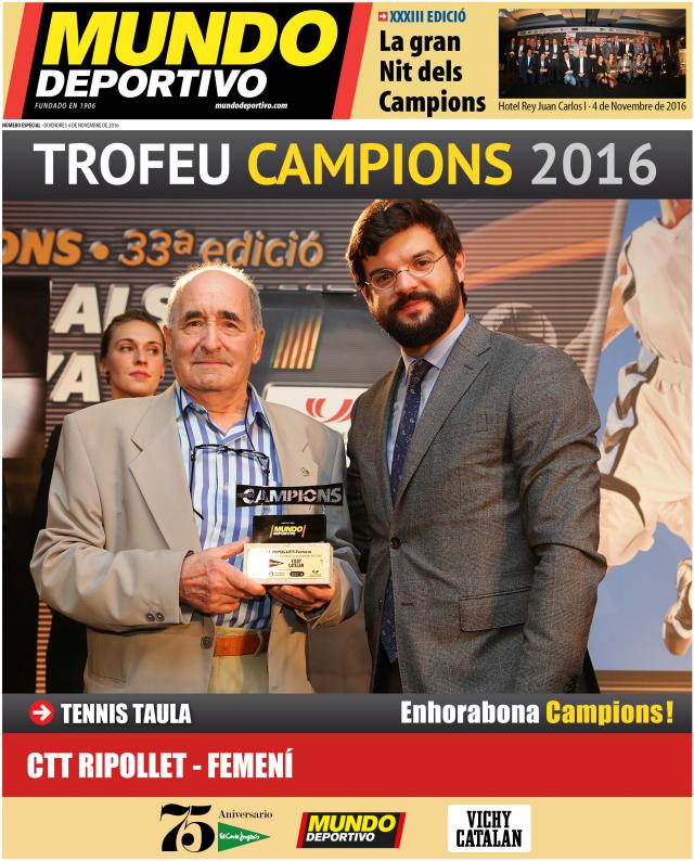 El diari esportiu 'Mundo Deportivo' ha premiat el Club Tennis Taula Ripollet per l'ascens de l'equip masculí a la Segona Divisió Nacional i del femení Autoescola Tatchepol a Divisió d'Honor. L'acte 'La Gran Nit dels Campions 2016' va tenir lloc a l'Hotel Juan Carlos I, a Barcelona.