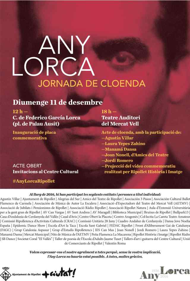 El Teatre Auditori del Mercat Vell acollirà el proper diumenge 11 de desembre el gran acte de cloenda de l'Any Lorca. A partir de les 18 hores, la poesia, la música i la dansa es tornaran a aliar per posar el punt final a un programa que ha tingut al voltant d'una cinquantena d'activitats, organitzades per una quarantena d'entitats i particulars de Ripollet, a banda dels que s'han organitzat des de l'Ajuntament.
