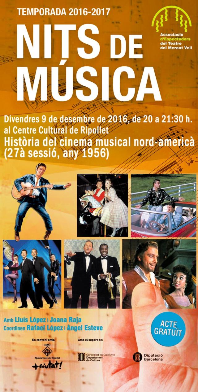 Aquest divendres, 9 de desembre, el Centre Cultural acull una nova edició de les Nits de Música. En aquesta ocasió, l'esdeveniment torna a repassar la Història del cinema musical nord-americà. Es tracta de la 27a sessió, i estarà centrada en alguns films destacats de l'any 1956. Com sempre, l'entrada és gratuïta i l'acte estarà conduït per Joana Raja i Lluís López. Començarà a les 20 hores.