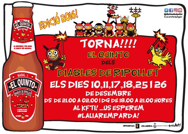 Un any més, els Diables de Ripollet organitzen el tradicional Quinto dels Diables, una celebració que enguany arriba a la seva 12a edició. Durant els propers caps de setmana, fins al dia de Sant Esteve, el Kftí acollirà les diverses cites del Quinto, que repartirà un munt de regals gentilesa dels establiments col·laboradors. El tret de sortida del Quinto dels Diables 2016 tindrà lloc aquest dissabte, 10 de desembre, a les 12 hores. Els Diables organitzen a la plaça de Pere Quart una tabalada promocional del Quinto. Aquest mateix dissabte, des de les 21 hores fins a les dues de la matinada, el Kftí acull la primera sessió del Quinto.