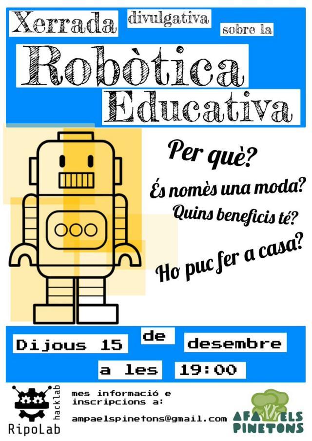 L'escola Els Pinetons acollirà el 15 de desembre, a partir de les set de la tarda, una xerrada divulgativa sobre la robòtica educativa, la qual anirà a càrrec de Jorge Pérez, impulsor del projecte Ripolab Hacklab, organitzadora de l'activitat. L'acte serà obert a tothom i gratuïta.