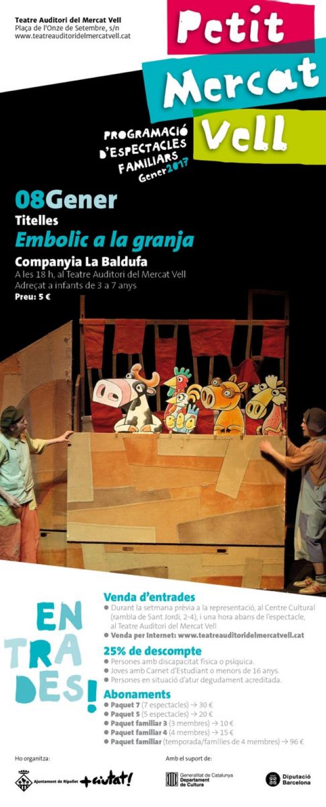 Embolic a la granja és el títol de la nova obra que es podrà veure diumenge, 8 de gener, al Teatre Auditori del Mercat Vell dins el cicle Petit Mercat Vell. L'obra de titelles començarà a les sis de la tarda. El preu és de 5 euros, amb possibilitats d'abonaments i diversos descomptes. Les entrades es poden adquirir a través del web del Teatre Auditori.