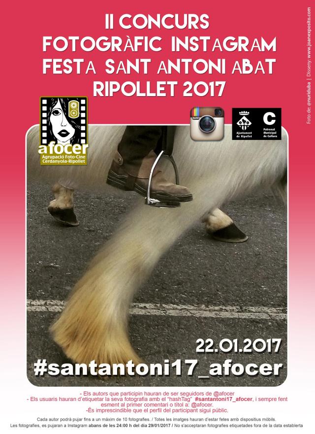 L'Agrupació Foto-Cine Cerdanyola-Ripollet (Afocer) ha obert la convocatòria del segon Concurs Fotogràfic Instagram de la Festa de Sant Antoni Abat. Cada participant haurà de pujar un màxim de deu imatges de la 124a festa dels Tres Tombs que tindrà lloc diumenge, 22 de gener. Les fotos hauran d'estar fetes amb dispositius mòbils i s'han d'etiquetar amb #santantoni17_afocer i fent menció a @afocer.