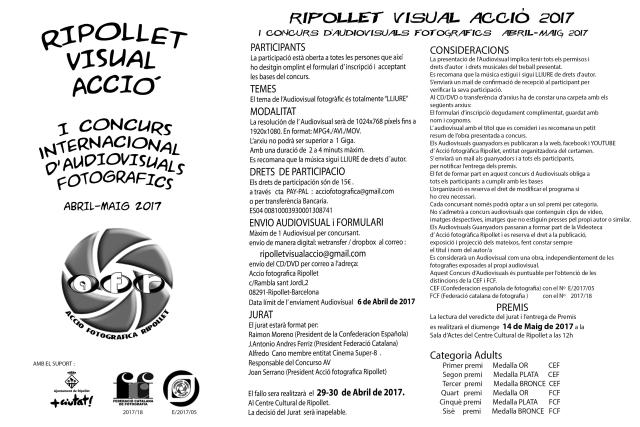 Qui encara hi estigui interessat en enviar la seva proposta, ho pot fer de manera digital al correu ripolletvisualaccio@gmail.com, a través de Dropbox o Wetransfer; o bé per correu ordinari en format CD/DVD al Centre Cultural (rbla. de Sant Jordi, 2). A més, els participants han d'abonar el preu de 15 € en concepte de drets de participació.