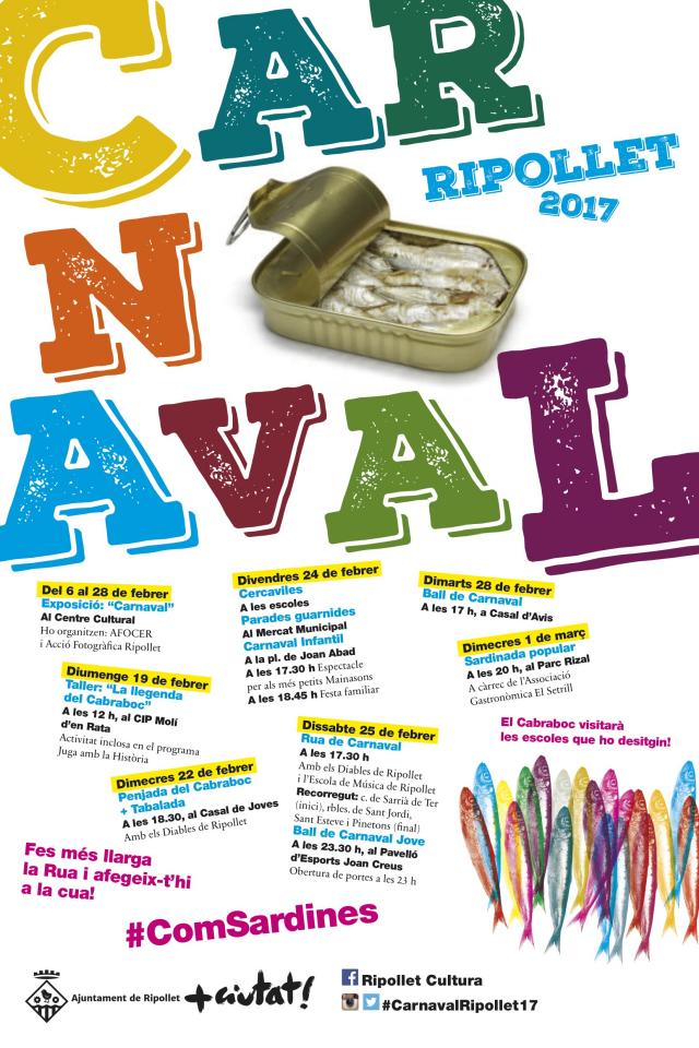 El programa d'activitats del Carnaval d'enguany s'ha presentat aquest dimarts, 31 de gener. El regidor de Cultura, Oriol Mor, va repassar les diferents activitats i, sobretot, les novetats que es duran a terme. Enguany es vol fomentar la participació de tots els ripolletencs a la Rua de Carnaval, que tindrà lloc dissabte 25, a les 17.30 hores. Per aquesta raó, s'ha creat el hashtag #ComSardines perquè, a través de les xarxes, tothom pugui penjar fotos del Carnaval i fer comentaris. Una altra novetat destacada és que la Rua té el lema 'Fes més llarga la Rua i afegeix-t'hi a la cua!'. La intenció és que els veïns es vagin afegint a la Rua, per fer-la ben gran, i que tothom participi al final de festa amb DJ a la rambla Pinetons. La Rua s'iniciarà al carrer de Sarrià de Ter i el recorregut passarà per les rambles de Sant Jordi i Sant Esteve. L'Escola de Música serà la primera comparsa de la Rua. La data límit per inscriure una comparsa és el dia 17 de febrer.