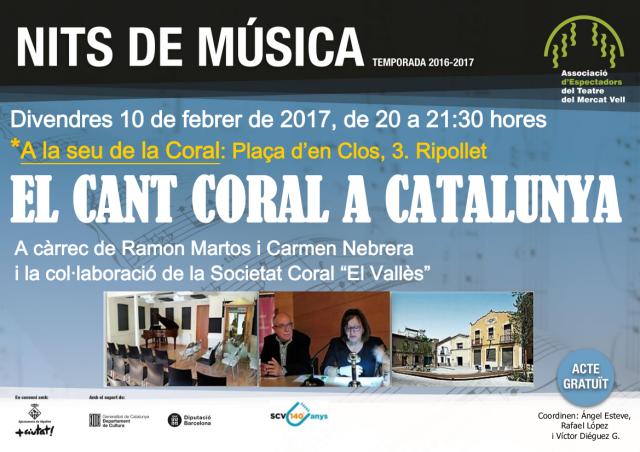El cant coral a Catalunya és el tema de la nova sessió de les Nits de Música que tindran lloc el 10 de febrer a la seu de la Societat Coral "El Vallès", a partir de les vuit del vespre. L'acte anirà a càrrec de l'historiador local Ramon Martos i Carme Nebrera, membre de la comissió organitzadora del 140è aniversari de la Societat Coral "El Vallès".