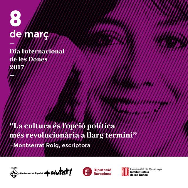 Com no pot ser d'altra forma, la dona protagonitza totes aquestes activitats de la programació del Dia Internacional de les Dones des de diferents òptiques: lluitant per la igualtat, contra els tòpics i estereotips, a favor de la diversitat i dones fent història. Enguany, també la imatge d'aquesta diada commemorativa ha volgut ser reivindicativa. Les encarregades de recordar-nos que s'ha de continuar lluitant per la igualtat són Montserrat Roig, Neus Català, Federica Montseny i Teresa Claramunt. Tots els actes estan oberts al públic en general i no cal inscripció prèvia, llevat del sopar-debat del dia 11 de març que requereix reserva.