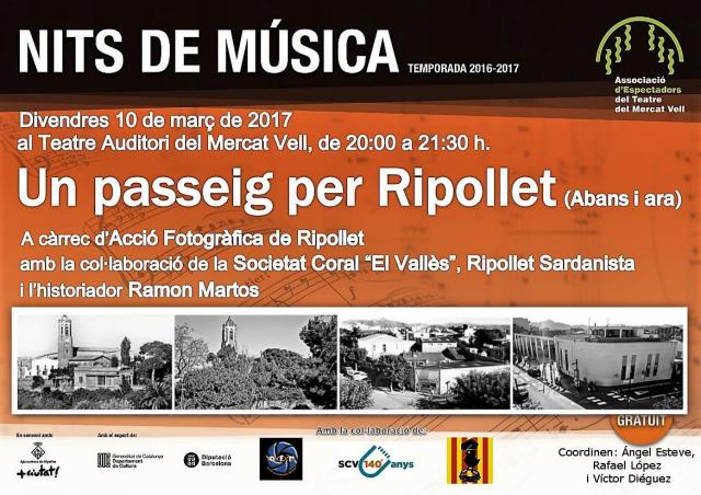 El Teatre Auditori del Mercat Vell acull aquest pròxim divendres, 10 de març, una sessió de les Nits de Música ben especial. Sota el títol 'Un passeig per Ripollet (abans i ara)', hi col·laboren Acció Fotogràfica Ripollet, la Societat Coral "El Vallès", Ripollet Sardanista i l'historiador Ramon Martos. La sessió començarà a les 20 hores i, com sempre, es tracta d'un acte gratuït.