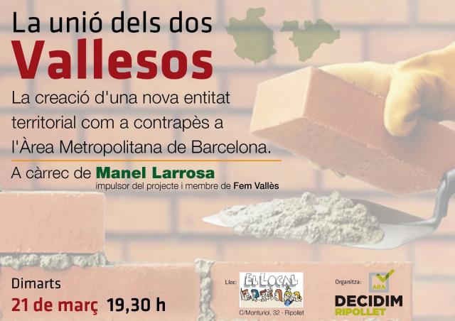 Decidim Ripollet organitza aquest dimarts, 21 de març, una xerrada-debat sobre el projecte d'unió del Vallès Oriental i l'Occidental. L'acte tindrà lloc a partir de les 19.30 hores al Local, al número 32 del carrer de Monturiol, i serà presentat per l'arquitecte sabadellenc Manel Larrosa. L'activitat s'emmarca dins un nou cicle que la coalició política organitza al Local i al qual convida tota la ciutadania.