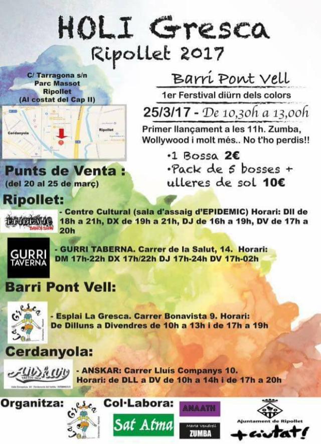 Tot és a punt per al primer festival holi diürn de Ripollet. La cita tindrà lloc dissante, 8 d'abril, al barri del Pont Vell, concretament al carrer de Tarragona, al parc de Massot, al costat del CAP II, entre les 10.30 i les 13 hores. El primer llançament es farà a les 11 hores i els assistents podran gaudir de zumba i dansa Bollywood, entre altres activitats.